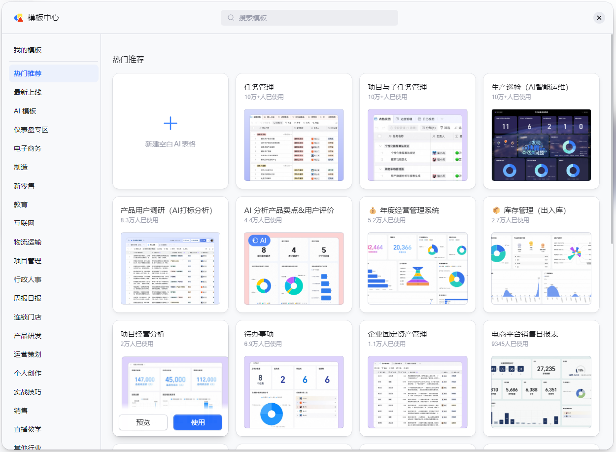 - 模板中心真救命:别从零画表了!搜“产品用户调研”“体验度量”模板,改改字段立马上手。