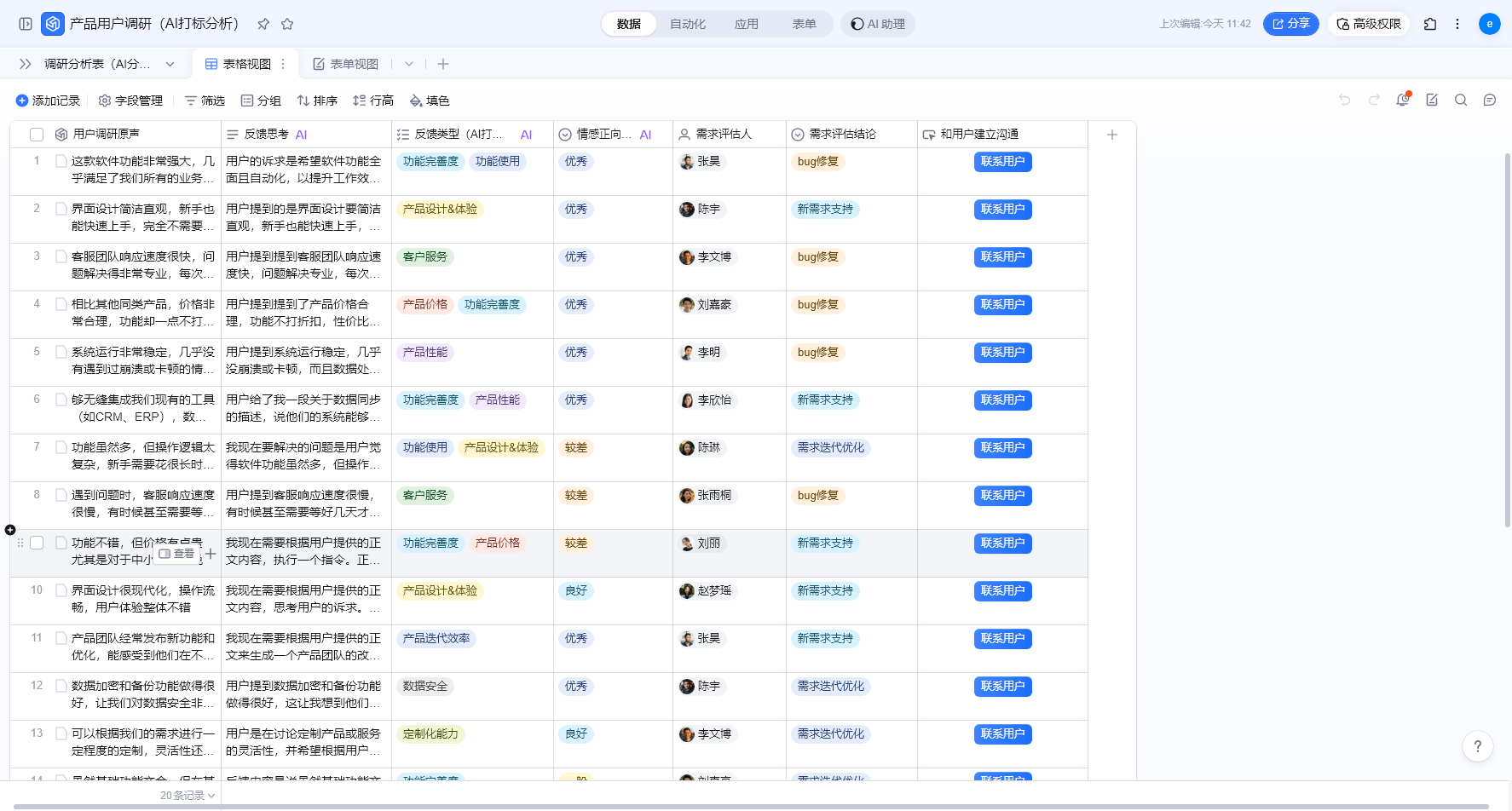 实战场景: 我把各个渠道的反馈全拖进表格,自动按产品模块、反馈类型、紧急度打标签。产品、运营、研发各取所需,用筛选视图只看自己关心的部分,彻底告别“那个反馈邮件发我一下”的日常拉锯。 [图片:按渠道、模块、情绪自动分类的用户反馈库]