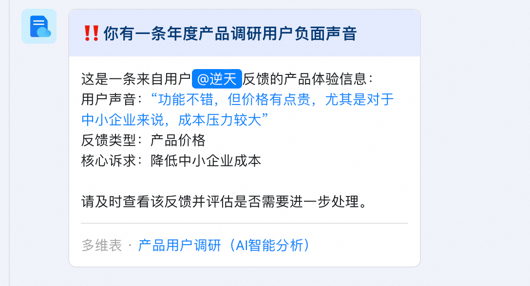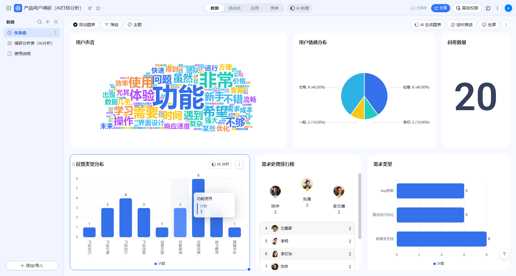 - 数据自己会说话:自动生成反馈趋势、情绪分布、模块问题热度图,像个「AI调研助理」。