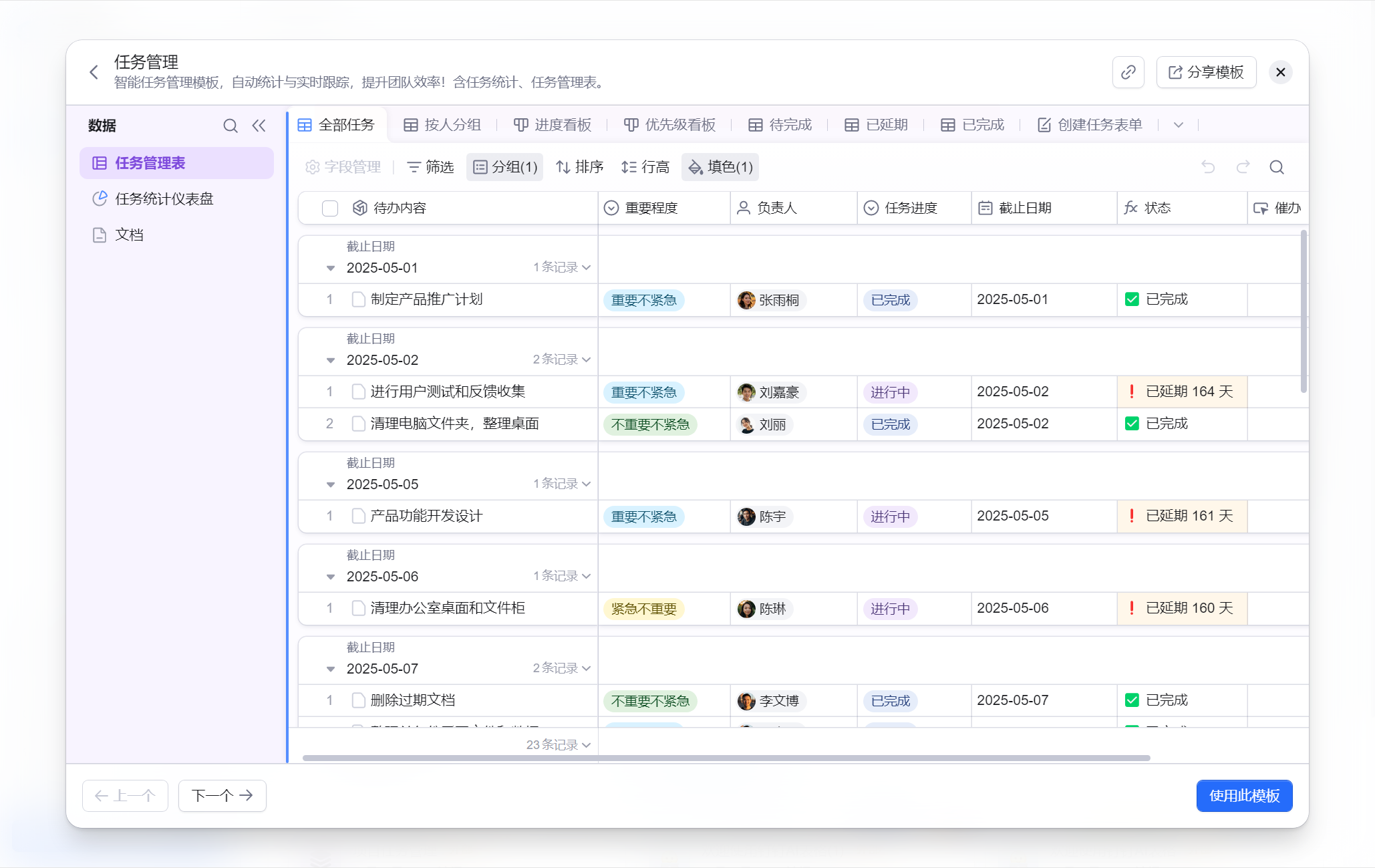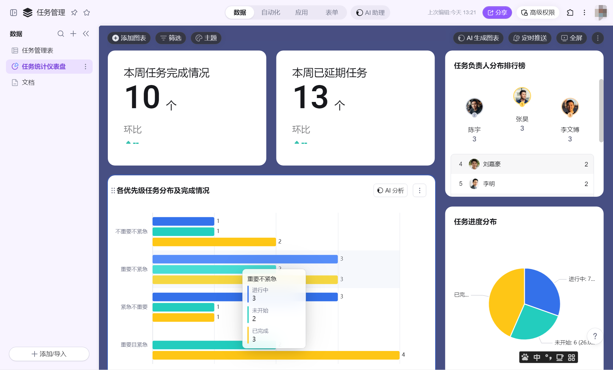 - 看板视图:直观掌握“待开始”、“进行中”、“已完成”各阶段的任务分布。