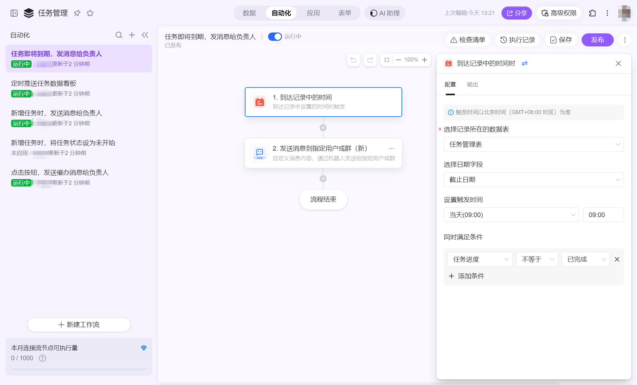 - 状态驱动:任务状态变更为“待开始”时,自动给负责人发提醒;变更为“已完成”时,自动通知测试或下游环节同事。