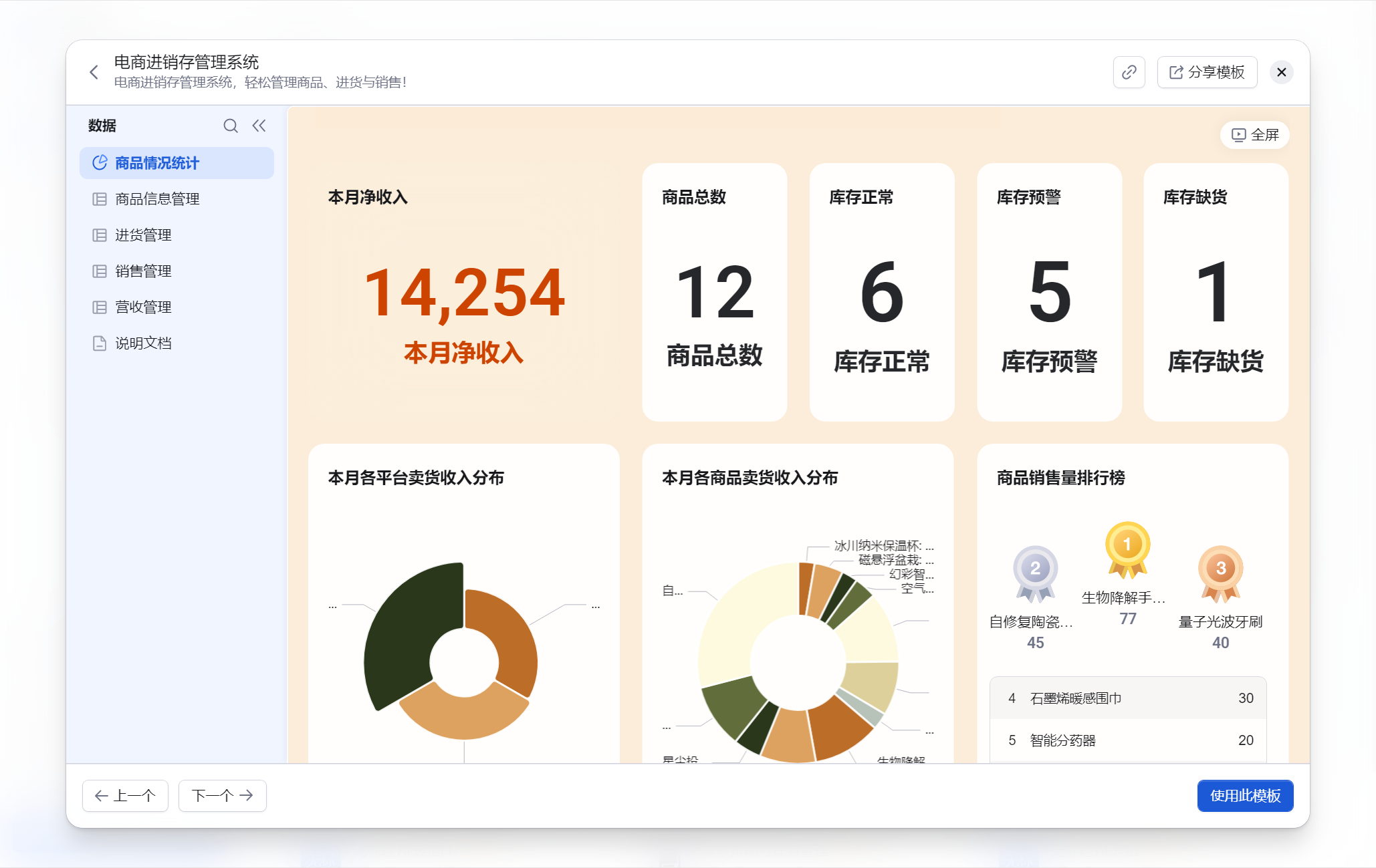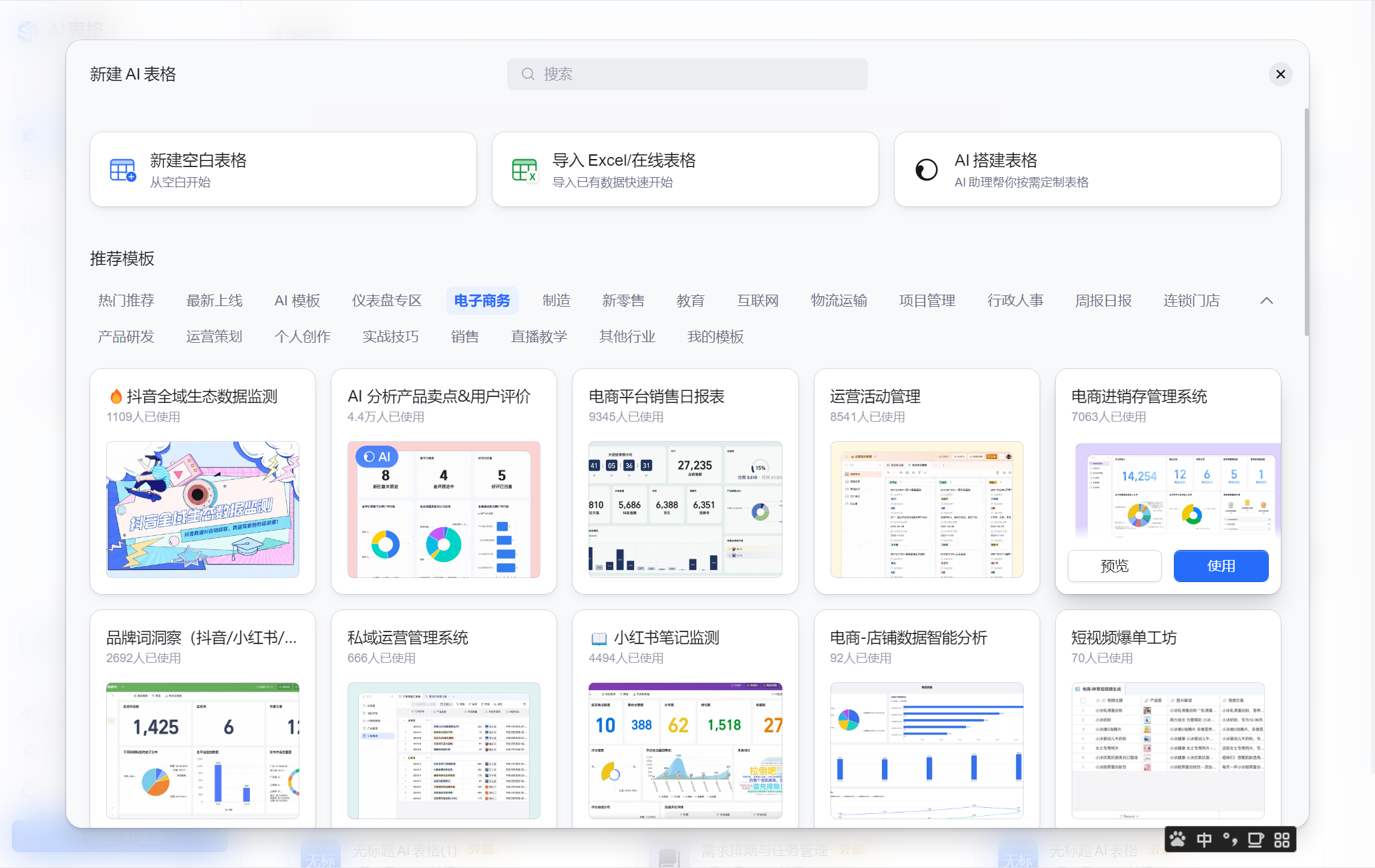 - 路径:钉钉工作台 → AI表格 → 新建 → 在“电子商务”分类下选择“电商进销存管理系统”。