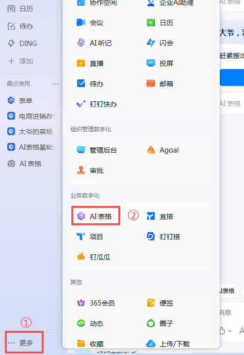 1.可以在钉钉客户端左下角,点击[ 更多 ],然后找到【AI表格】,点击后就可以进入了。