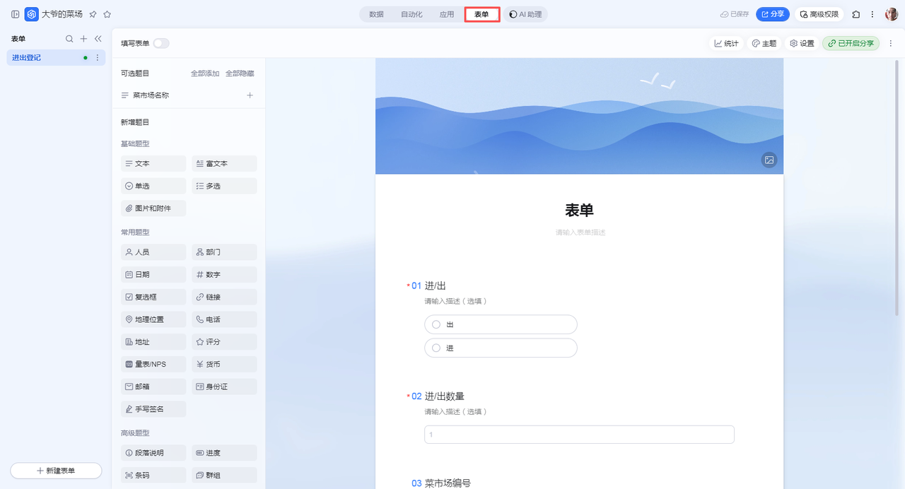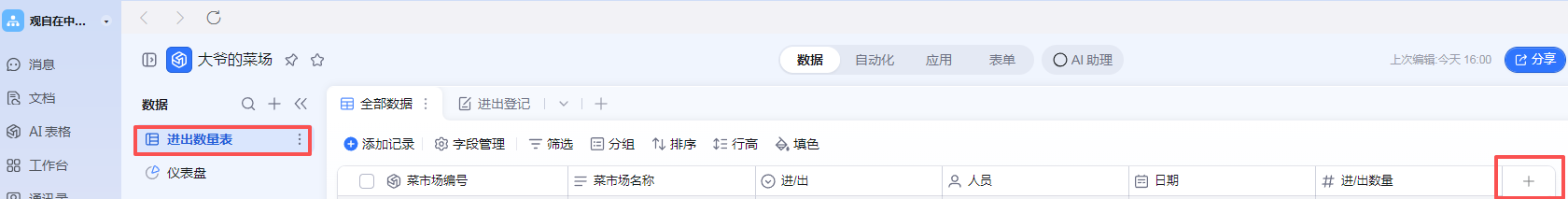 这次用到了两张表:车辆进出记录表和菜场车位表,在钉钉直接创建两张表。