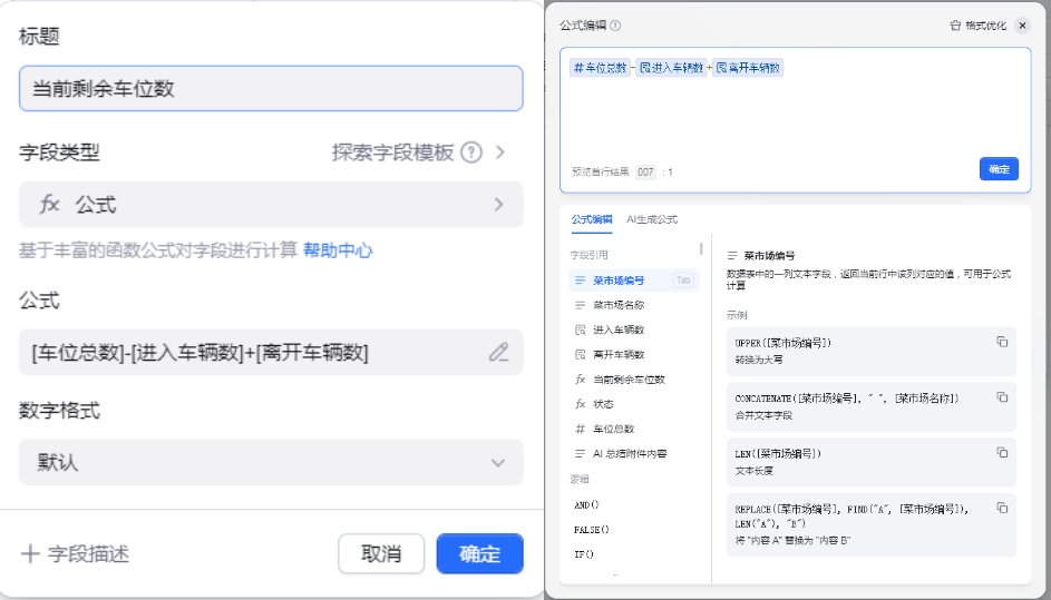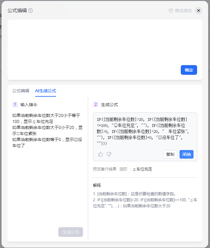 这个就是根据当前剩余车位数进行展示,不是固定的值,因此也需要用到公式,可惜我不会写,不过没关系,AI表格可以用AI来生成公式,我们只需要文字告诉AI我们需要什么就行。