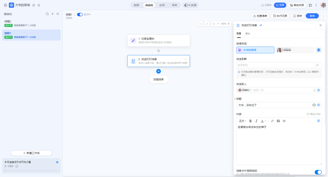 我们在【自动化】中进行创建,这个提醒比较简单,没有分支操作,直接是在“记录变更时”进行提醒操作,关联的都是车位表,关联字段是当前剩余车位数,如果剩余车位是0的时候,那么提醒大爷要拿牌子了,如果是1的时候,需要大爷去看看是否有牌子,有的话就拿走。
