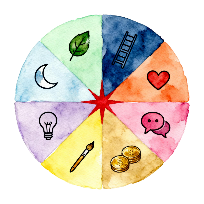 “生命之花”(Life Wheel),又称生命平衡轮,是一个经典的个人成长工具。它将人生划分为8个关键维度,构成一朵八瓣花瓣的花: