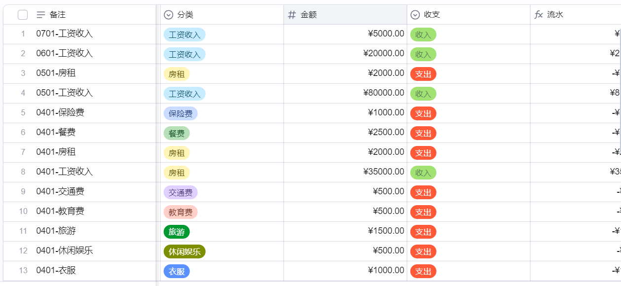 - 字段:收支类型、金额、分类、支付方式、必要度评分