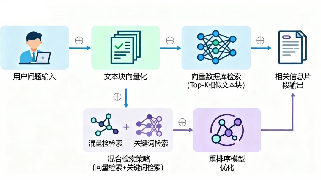 但光靠向量检索有时候还不够。比如有些专业术语有多种表达方式,或者用户的问题表述不够清晰,这时候可能需要结合其他检索方法。现在常用的是混合检索策略,比如把向量检索和关键词检索结合起来,或者在向量检索的基础上再用一个重排序(Rerank)模型对结果进行优化。