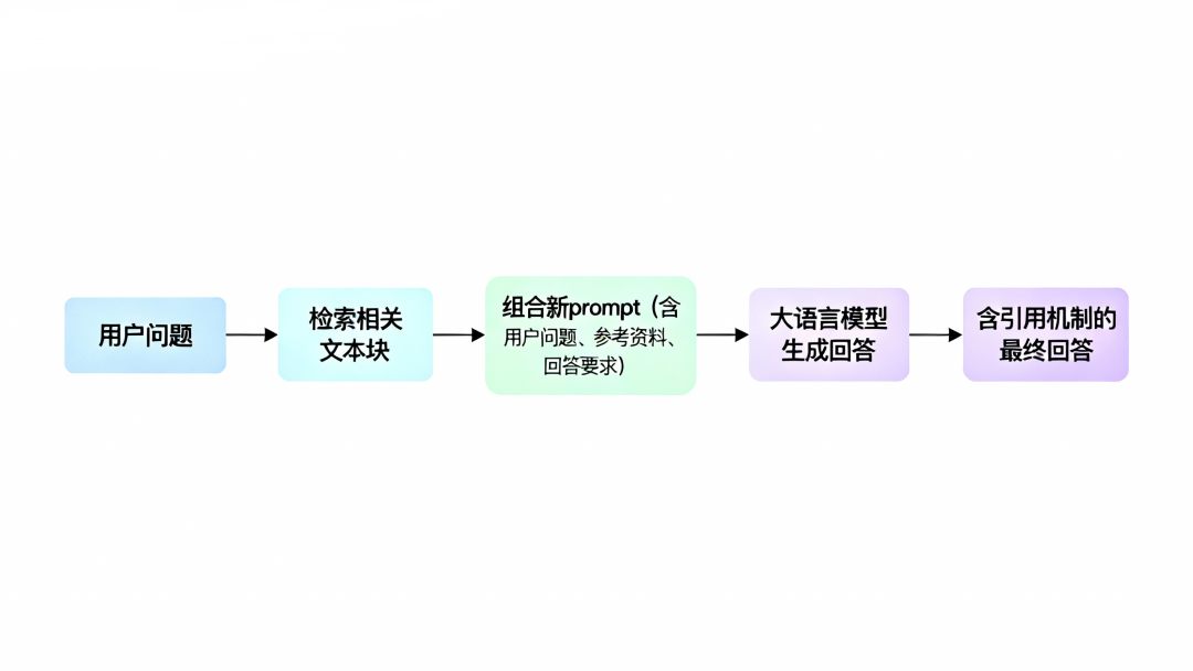 具体怎么做呢?系统会把用户的问题和检索到的相关文本块组合成一个新的输入 prompt,然后把这个 prompt 交给大语言模型。prompt 里一般会包含这些信息:用户的问题、找到的参考资料、以及对回答的要求(比如“基于以下参考资料回答问题,不要编造信息”)。