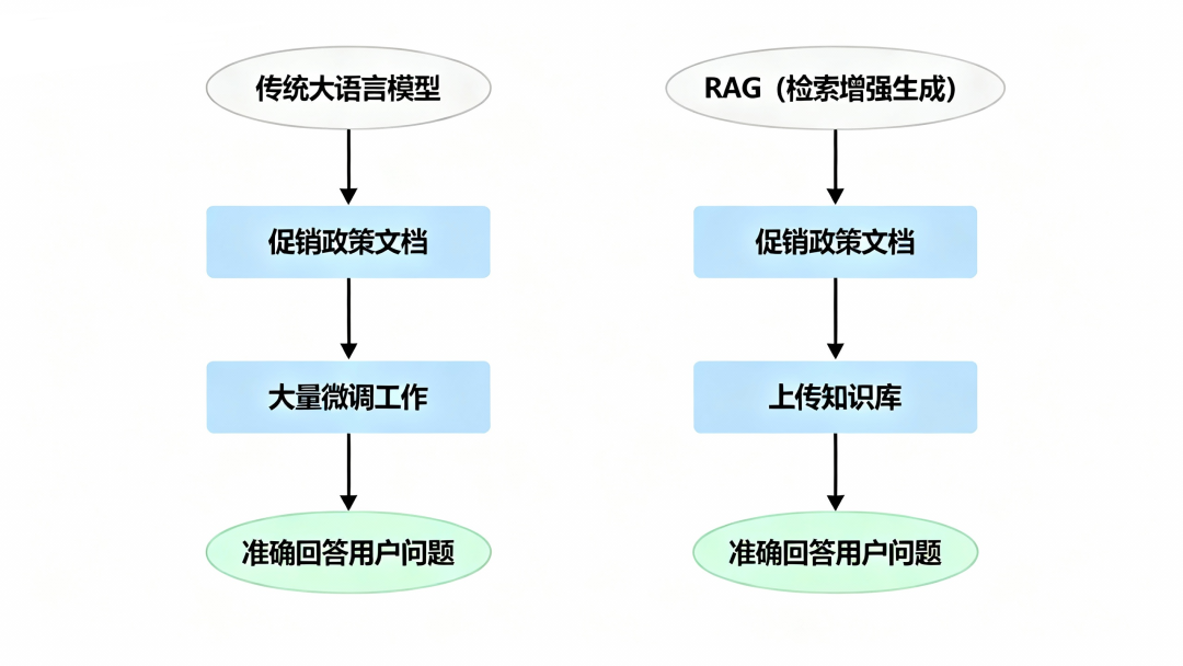 举个例子,假设你是一家电商公司,用AI做智能客服。每年“双11”之前,公司都会出台很多新的促销政策和活动规则。如果用传统的大语言模型,你需要把这些新规则都“教”给模型,可能要做大量的微调工作。但如果用RAG,你只需要把新的政策文档上传到知识库,客服AI就能立即掌握这些新信息,准确回答用户关于促销活动的问题。