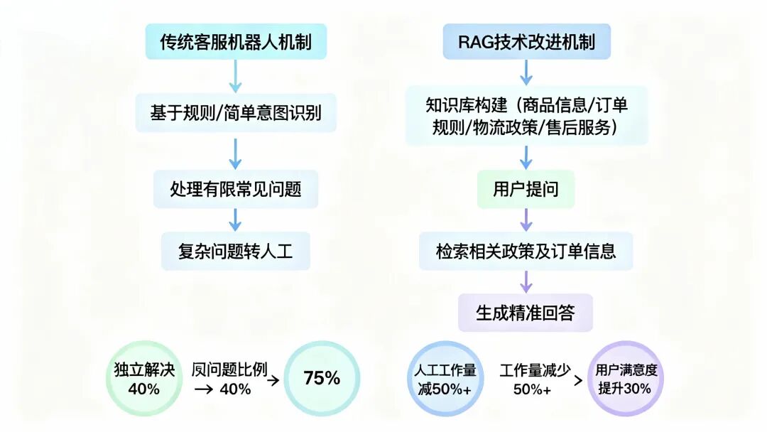 朋友给我看了一组数据:引入RAG后,他们的客服机器人独立解决问题的比例从原来的40%提升到了75%,人工客服的工作量减少了一半以上。更重要的是,用户满意度提高了30%,因为机器人给出的答案不再是套话,而是针对具体问题的精准解答。
