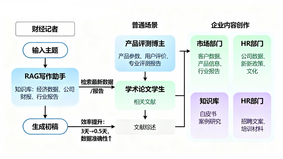 内容创作是另一个正在被RAG改变的领域。现在很多人用AI来辅助写作,但普通AI写作工具的问题是容易“编造”信息,尤其是在需要引用数据、案例或专业知识的时候。RAG技术则可以让AI写作建立在真实、可靠的信息基础上。