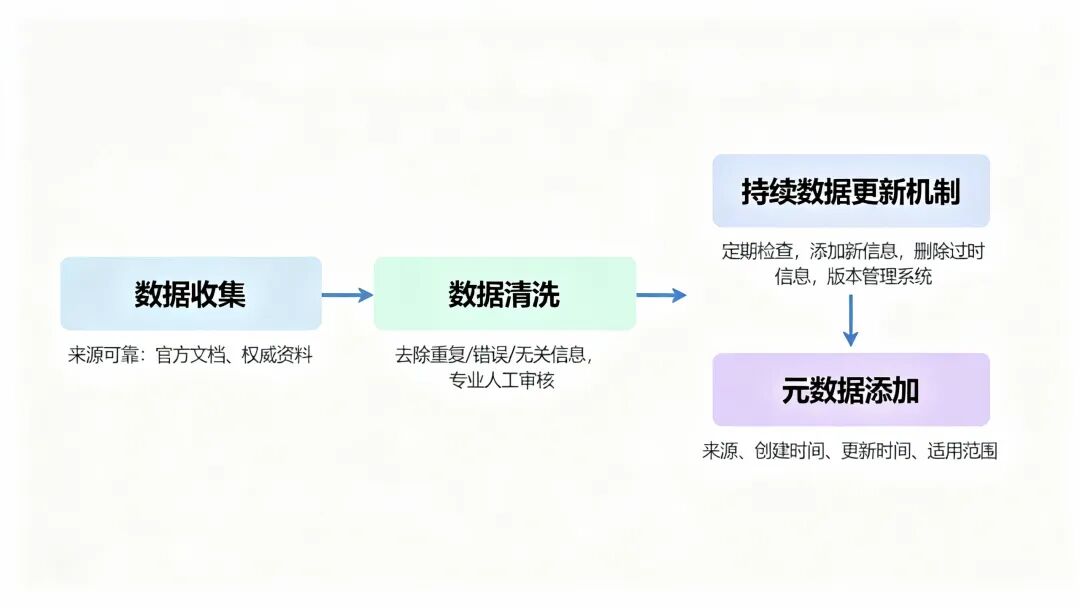 那怎么解决这些问题呢?关键在于建立严格的数据治理流程。首先是数据收集阶段,要确保来源可靠。优先选择官方文档、权威资料,避免使用非官方的、可能过时的信息。其次是数据清洗,要去除重复内容、错误信息和无关资料。对于重要的领域,最好有专业人员进行人工审核。
