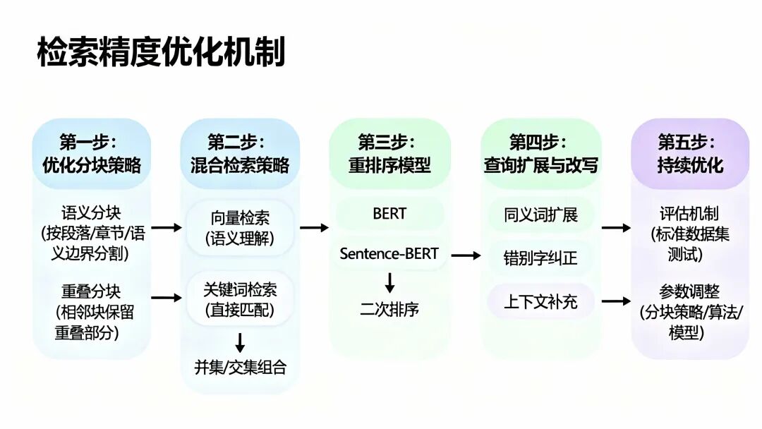 提高检索精度是一个持续优化的过程。很多公司会建立检索效果的评估机制,定期测试系统在标准数据集上的表现,然后根据结果调整分块策略、检索算法和模型参数。记住,没有一劳永逸的解决方案,只有不断优化的过程。