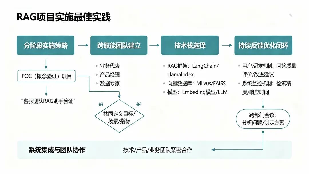 那如何应对这些挑战呢?最佳实践是采用分阶段实施策略。不要一开始就追求大而全,可以先从一个小场景入手,做一个POC(概念验证)项目。比如,先为一个产品线的客服团队构建RAG助手,验证效果后再逐步推广到其他产品线和部门。这样可以降低风险,快速获取反馈,及时调整方向。