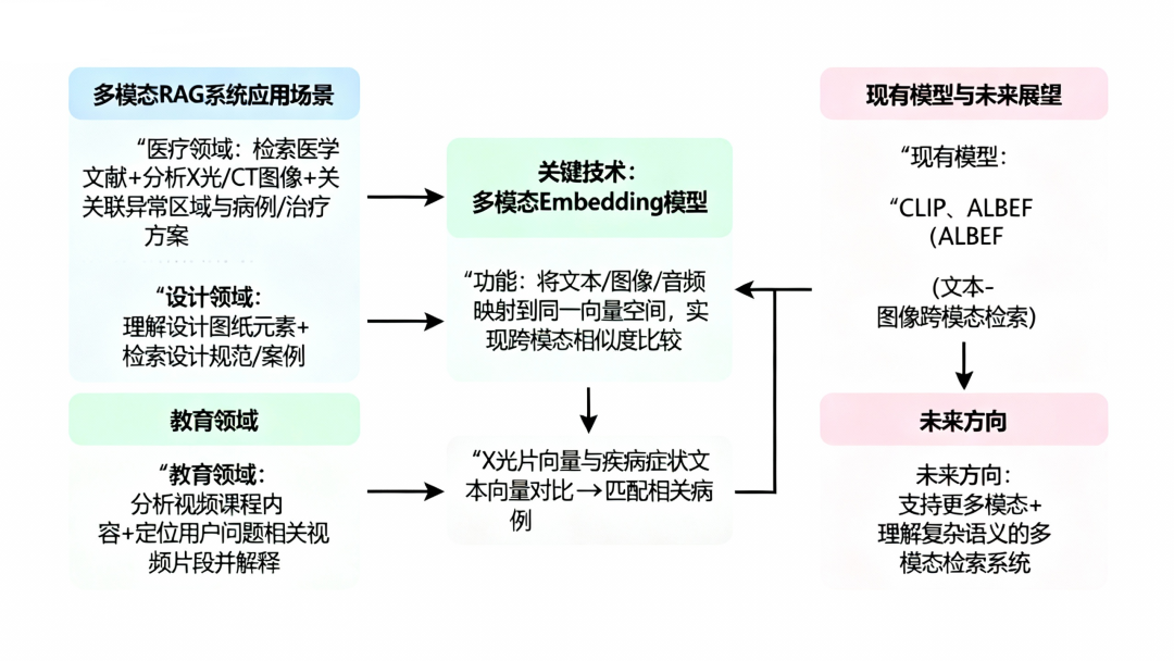 想象一下,在医疗领域,一个多模态RAG系统不仅能检索医学文献,还能分析X光片、CT图像,将图像中的异常区域与相关病例和治疗方案关联起来;在设计领域,系统能理解设计图纸中的元素,检索相关的设计规范和案例;在教育领域,系统能分析视频课程内容,根据用户的问题定位到具体的视频片段并进行解释。