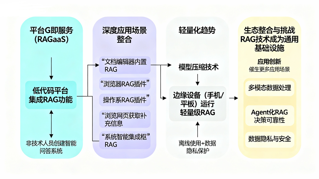 这种生态整合和轻量化的趋势,将让RAG技术从“专业工具”变成“通用基础设施”,就像现在的数据库和搜索引擎一样,成为互联网产品的标配。这不仅会加速RAG的普及,还会催生更多创新的应用场景。