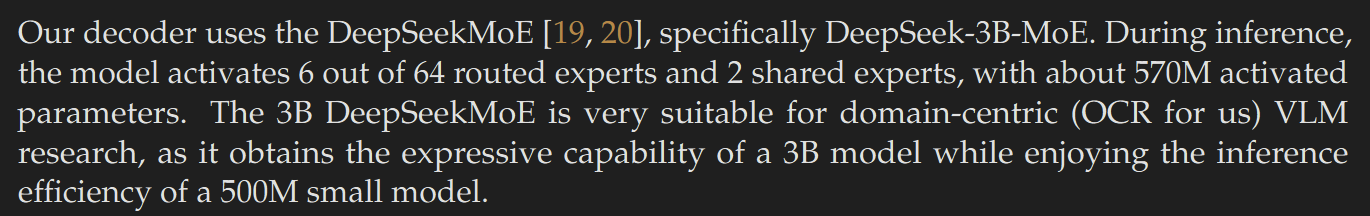 相比起将语言特征抽取融合组成新语言的编码器Encoder,Decoder的概念则是将Encoder转换得到的新语言转换回去,这就是解码器的概念。而DeepseekOCR中使用的MoEDecoder是之前Deepseek提出的一个多专家架构的解码器,每次激活64个路由专家中的6个和2个共享的专家,共计570M的激活参数,论文中说这个架构能够有30亿参数的模型的表达能力,以及5亿参数小模型的推理效率。原文如下: