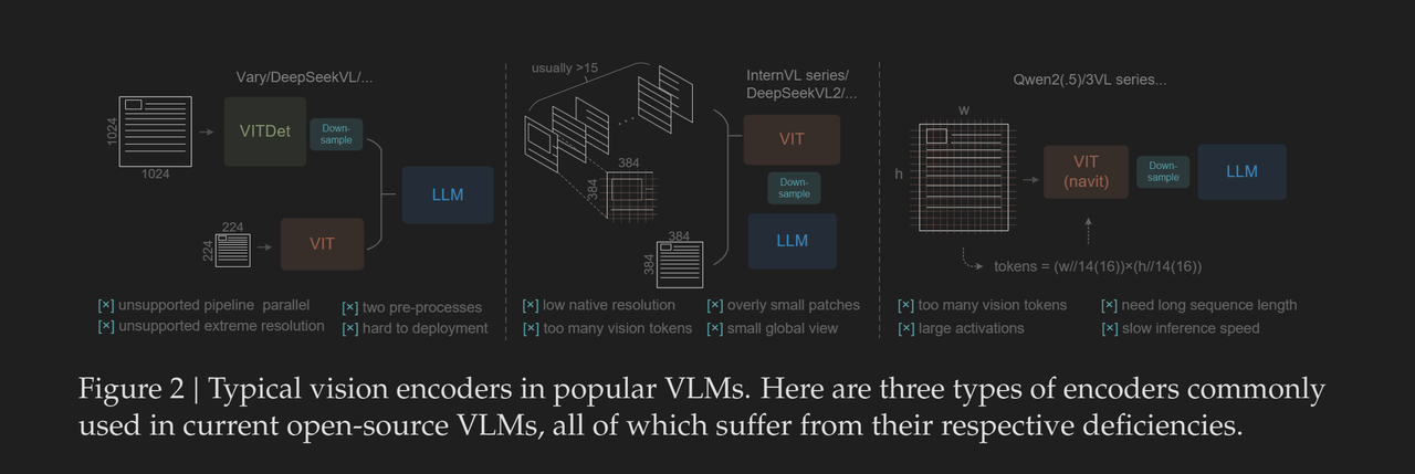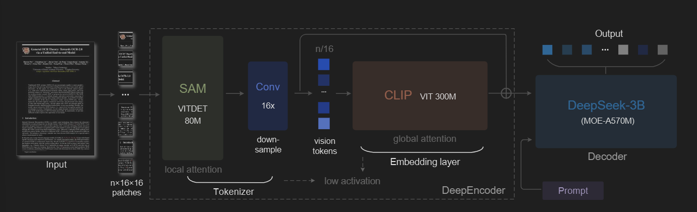 相比之下,DeepseekOCR提出的DeepEncoder架构通过SAM(局部专家)->激进压缩->CLIP(全局专家)这样一个非对称的专家流水线,将图片转化为少量Vision Token,一定程度上解决了以上架构面临的问题。