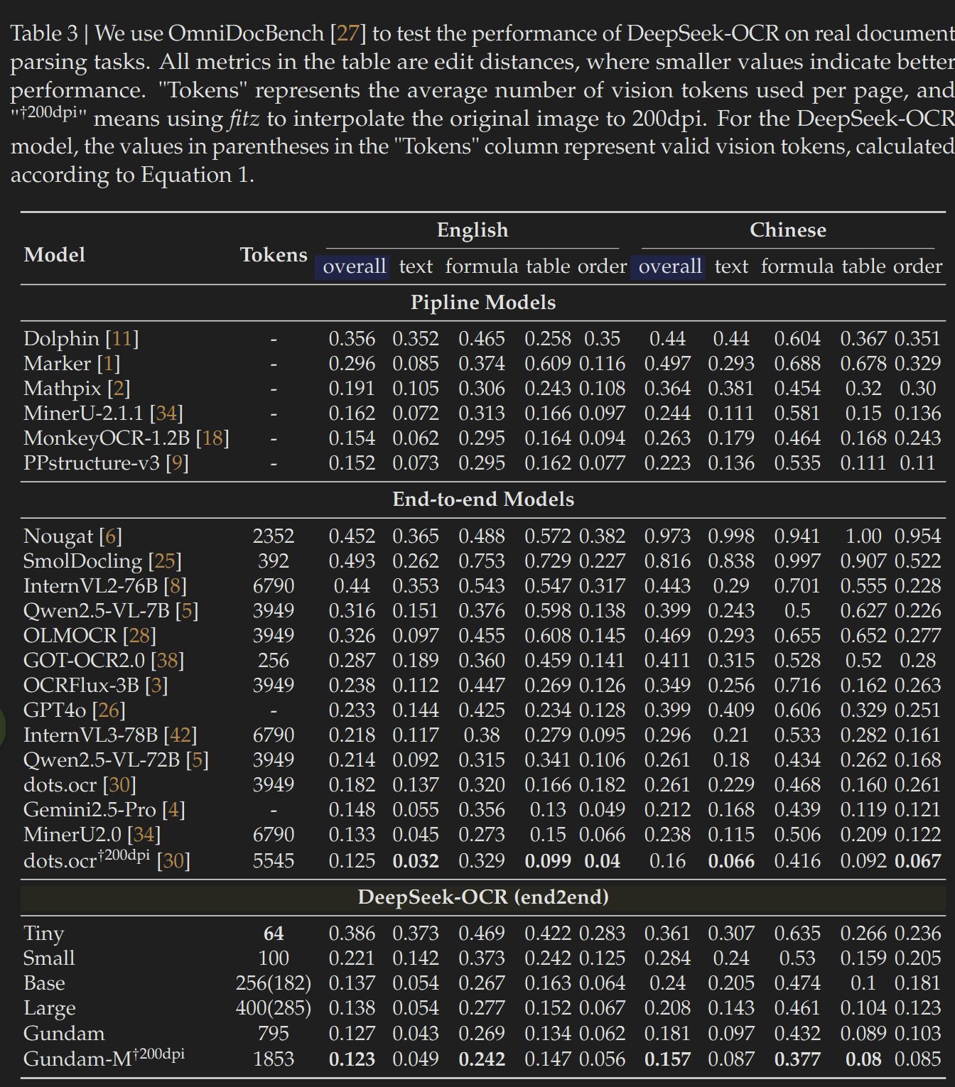 在上图中,我们能够看到Deepseek-OCR各个型号的模型在OmniDocBench这个测试集上的分数从最小Tiny型号的0.3+一路提高到Gundam-M的0.1+,这里的分数是Edit distances,编辑距离,假设一个模型的编辑距离得分为0.12,意味着它识别出来的内容经过12%的内容修改即可与原文完美匹配,所以理论上这个数值越低,模型性能越好。从表中我们可知:Deepseek-OCR Gundam-M(200dpi)在这个测试上取得了最高分,并且使用的VisonToken数量约是dots.ocr(200dpi)的三分之一。在使用800个Vison Token的情况下,DeepseekOCR的成绩比传统使用7000个Vision Token的模型还要好。