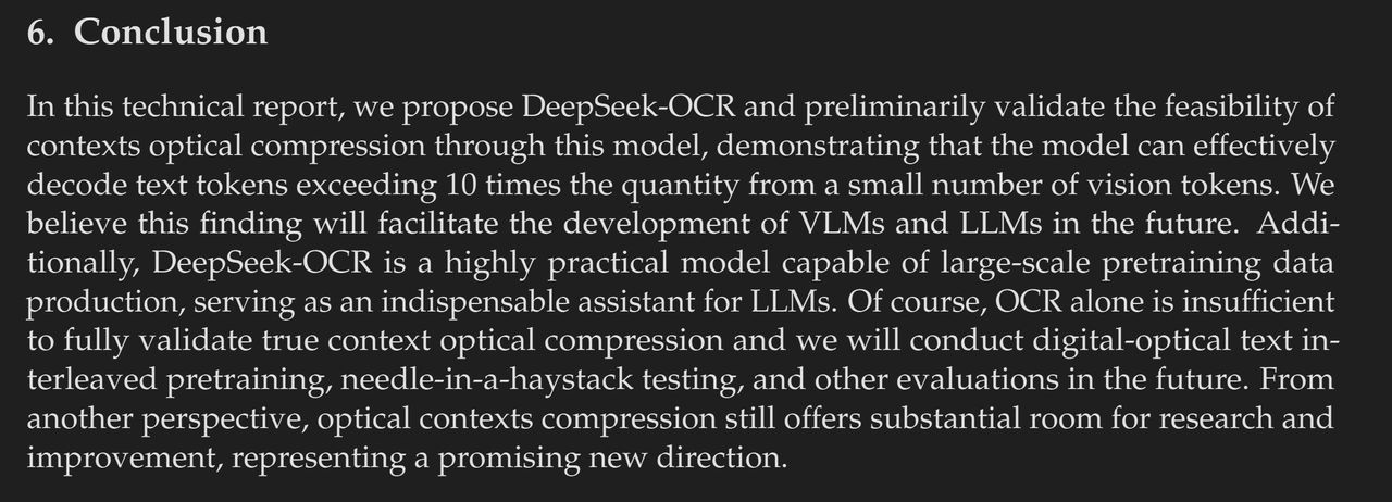 看一篇论文,上来就应该先看结论,DeepseekOCR的结论部分原文及翻译如下: