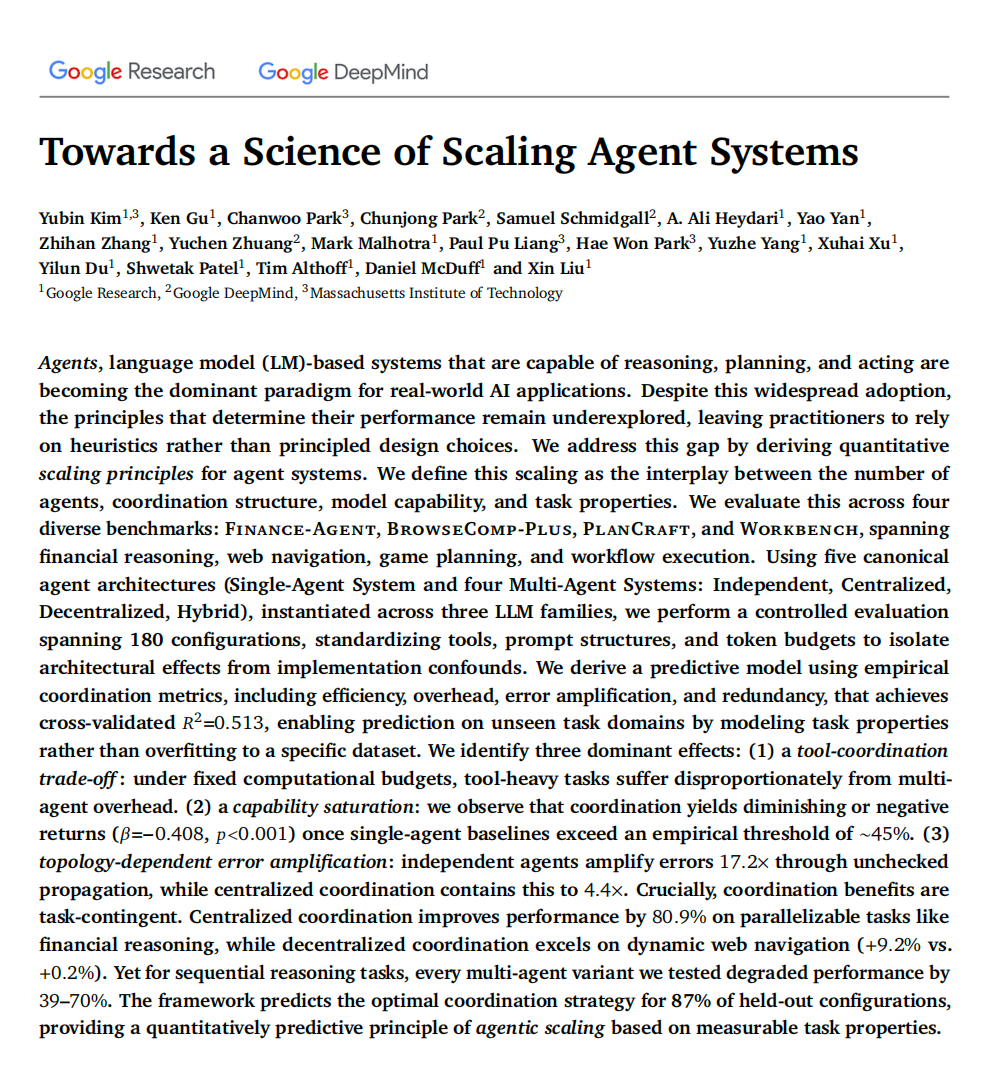 最近,Google DeepMind和Google Research刚刚联合发布了一篇重磅论文:《Towards a Science of Scaling Agent Systems》(迈向Agent系统的扩展科学)。
