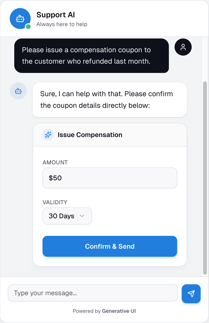 细节拆解: 当用户在对话框里说:“帮我给上个月退款的客户补偿一张优惠券。” 此时,AI不会甩给你一个操作链接。AI会直接调用后端的API,在当前的聊天流(Chat Stream)中,直接渲染出一个小巧的“优惠券配置卡片”。卡片上只有金额和确认按钮。用户在聊天框里点击确认,任务直接完成。