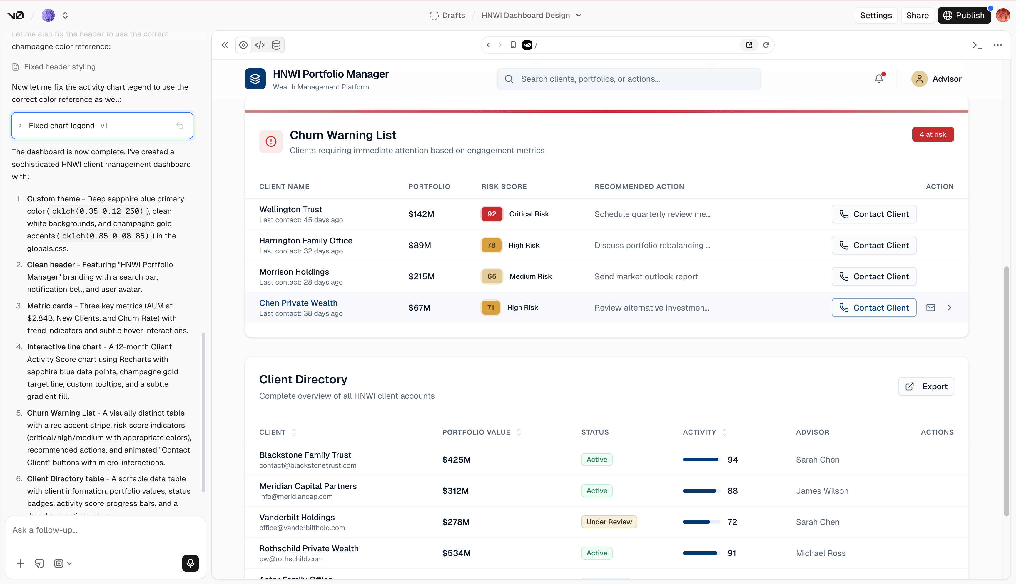 细节拆解: 当用户输入:“生成一个高净值客户管理面板,包含活跃度折线图和流失预警列表。” AI接收到文本后,并没有去生成一张静态的图片。而是大模型直接将“自然语言”翻译成“React代码逻辑结构”,并精准调用底层库(如Shadcn UI)里的“数据表格”和“图表组件”,严格遵循预设的CSS规范,在1秒内直接渲染出可点击、带真实微动效的前端界面。