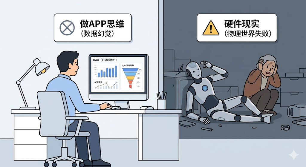 正如用户调研理论中指出的:定量分析只能告诉你“发生了什么”(What),而定性分析才能告诉你“为什么发生”(Why)。 在服务机器人赛道(如养老伴学、餐饮配送),我们根本没有千万级的DAU供我们去跑A/B测试。更要命的是,软件改一个Bug只需要发布一个热更新,而硬件机器人如果方向错了,开模、供应链、量产的试错成本动辄几百万甚至上千万。盲目的“试错迭代”在具身智能领域等于“自杀”。