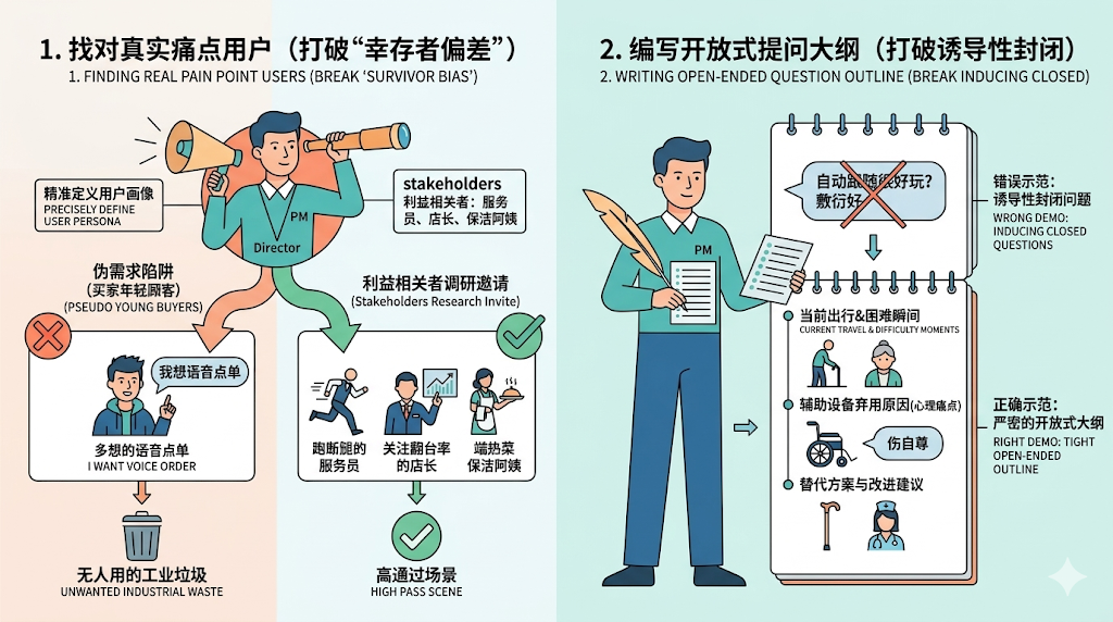准备阶段必须明确调研方向。假设我们要调研养老院里的“助行机器人”,千万不要问带有诱导性的封闭问题:“您难道不觉得我们这个自动跟随功能很好吗?” 这种问题除了得到一句敷衍的“好”,没有任何价值。