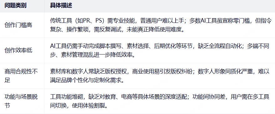 尽管AI创作赛道增长迅速,但当前市场上的产品仍存在诸多痛点。在我看来,行业痛点本质上是用户需求与产品能力的差距,也是产品设计、迭代的核心方向: