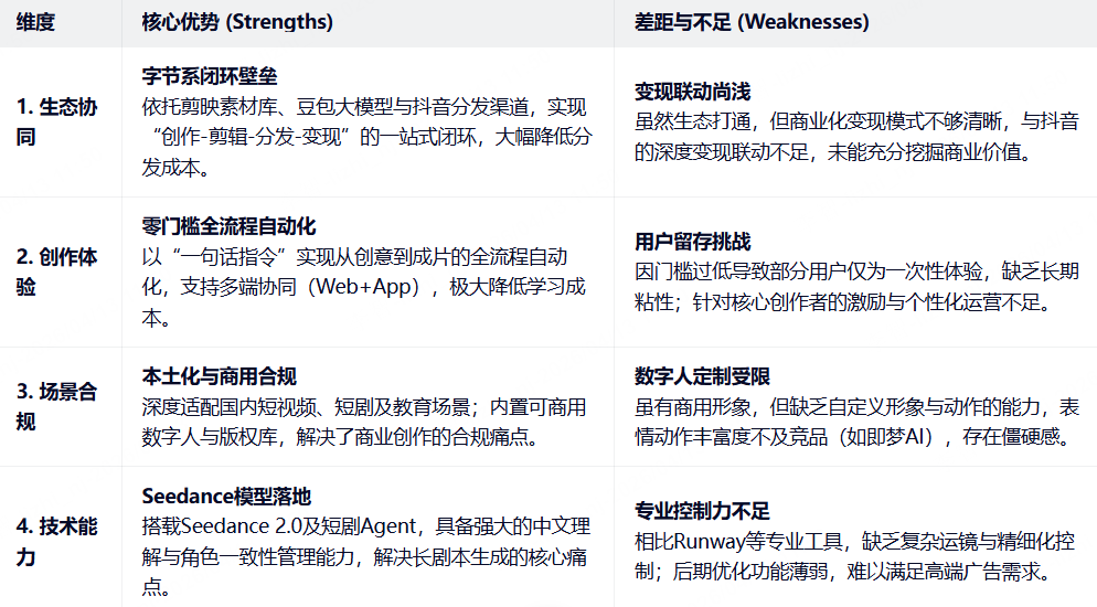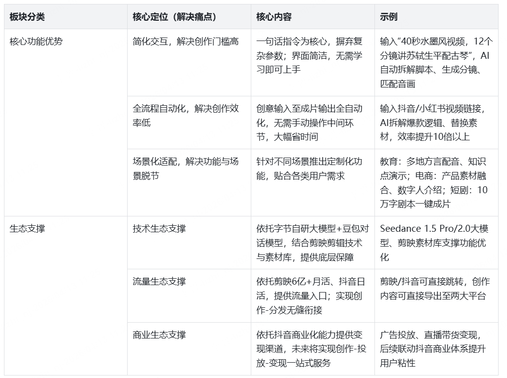 从PM视角来看,这个定位的优势在于精准切入市场空白:既避开了与即梦AI、Runway等专业工具的直接竞争,也区别于剪映AI的剪辑辅助定位,形成了全流程、零门槛的差异化优势;同时,这个定位也贴合字节系普惠化、规模化的产品战略,依托字节的流量优势,快速实现用户增长。