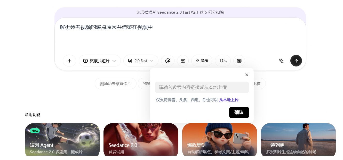 - 借助爆款复刻功能,快速获取创意:输入同赛道爆款视频链接,AI会自动拆解爆款逻辑(钩子设计、叙事节奏、配乐风格),上传自家素材(如自家宠物照片、生活片段),替换原视频主体,快速生成新视频,提升爆款概率