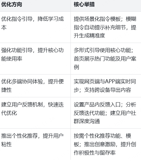 - 优化用户运营:推出个性化推荐功能,根据用户创作习惯,推荐功能、指令模板、素材;建立用户等级体系,对长期使用、优质创作的用户给予奖励(如免费商用素材、高级功能使用权);完善新手引导,降低用户学习成本,提升新手留存率。