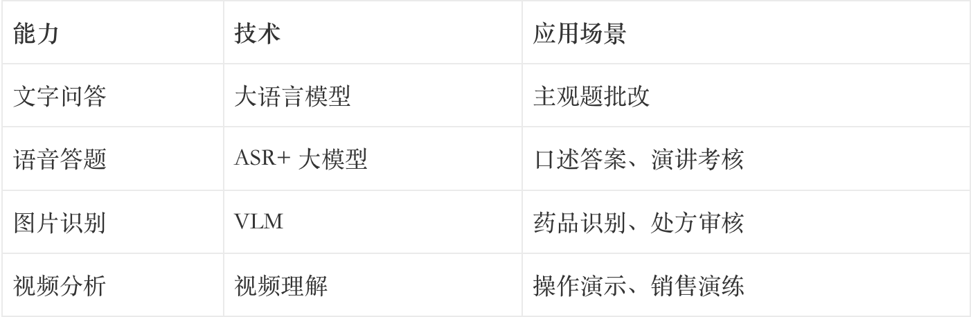 考生端 → 答题(文字/语音/图片/视频)→AI 批改(多模态模型)→ 结果反馈 →人工复核(主观题/高分争议)→ 最终成绩