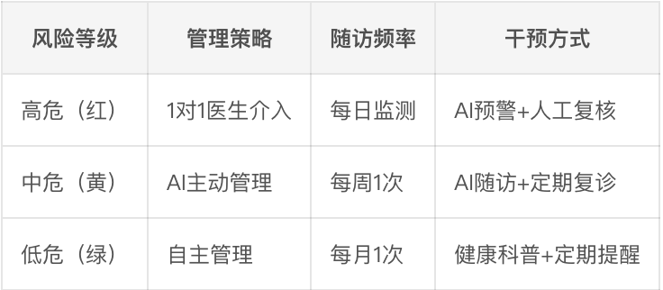 - 风险分层动态调整,高危患者自动升级管理级别;