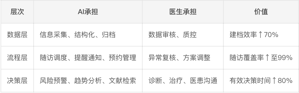 将医生从事务性工作(档案整理、随访通知)释放,聚焦高价值决策(方案调整、危急处置)。