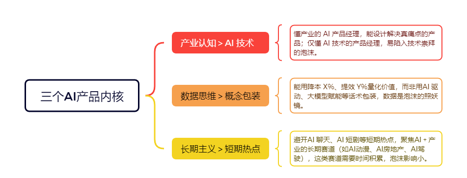 - 长期聚焦技术改造产业:AI 的终极价值是提升生产力,而非炒概念,产品经理若能持续深耕AI + 产业,终将在泡沫后收获红利。