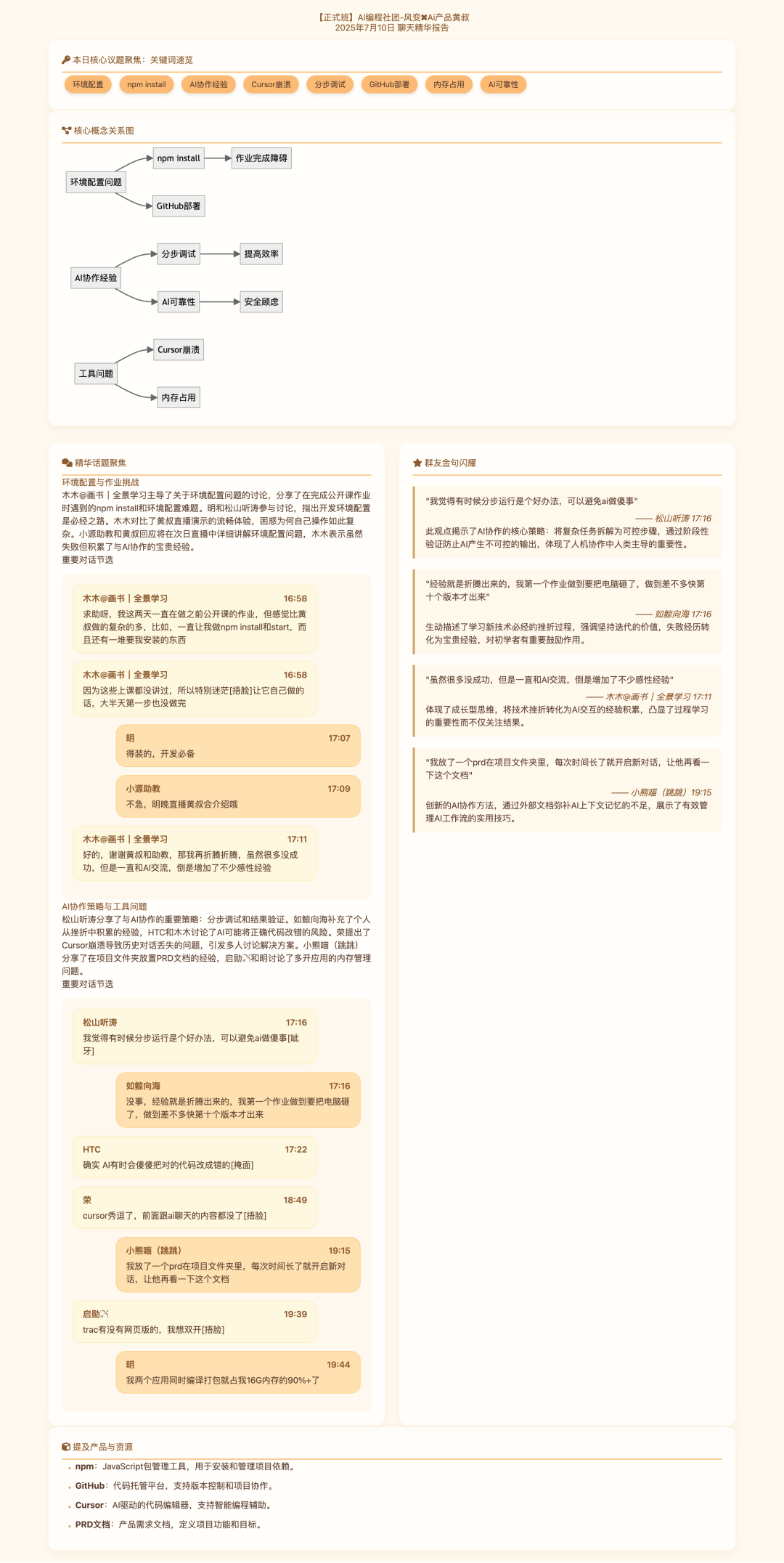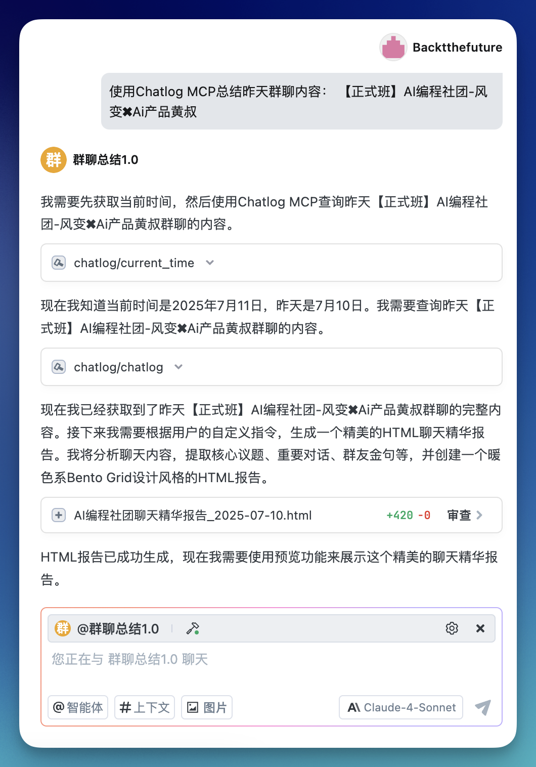 这就是它每天早上给我呈现的“情报简报”,比如我们AI编程社群昨天的群聊总结: