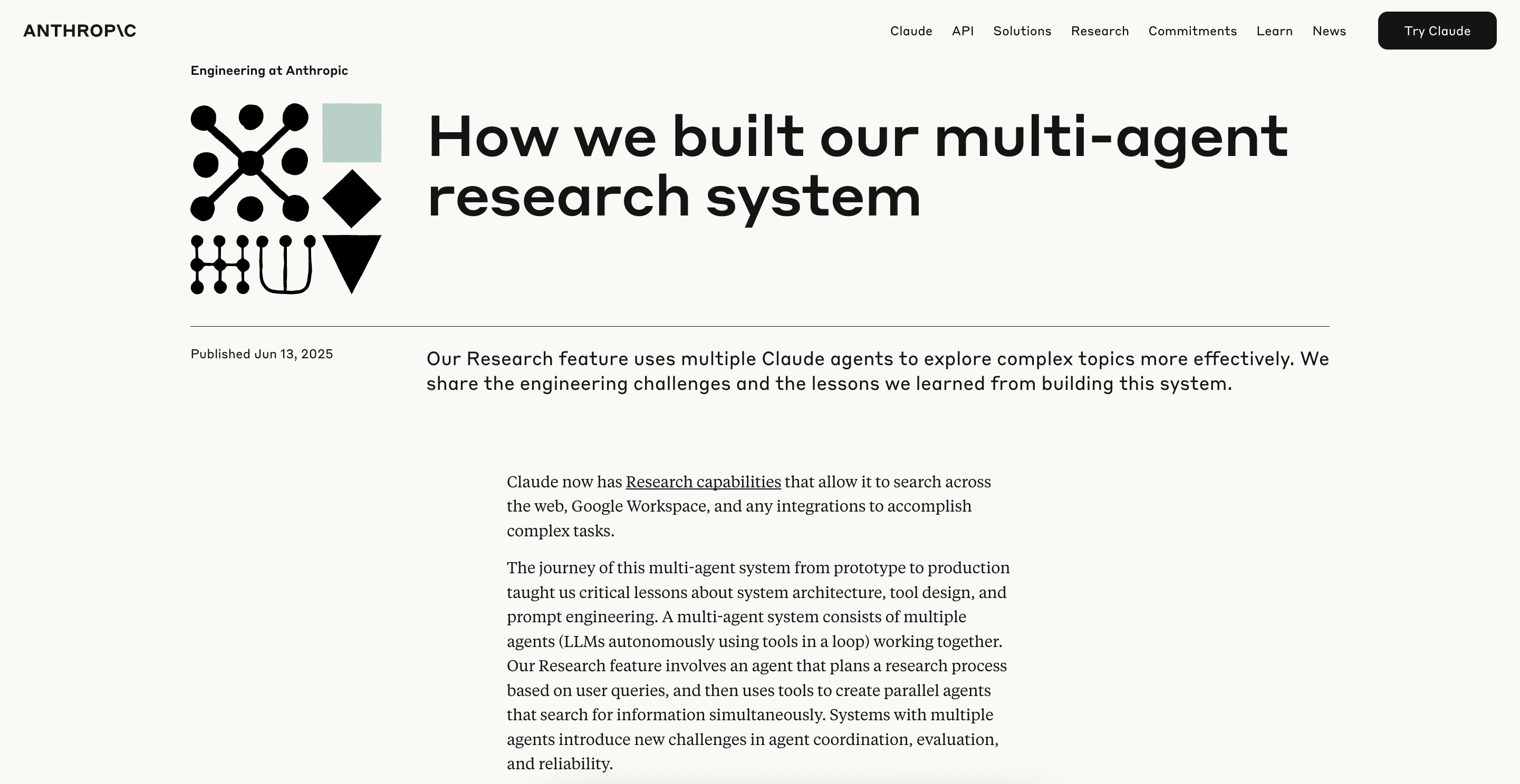 Anthropic 团队上个月发了一篇工程博客,讲述了他们如何构建Claude的多智能体研究系统。乍一看,这篇文章似乎是一个复杂的技术话题,但仔细读下来,你会发现它其实探讨的是一个更深层次的商业和技术问题: