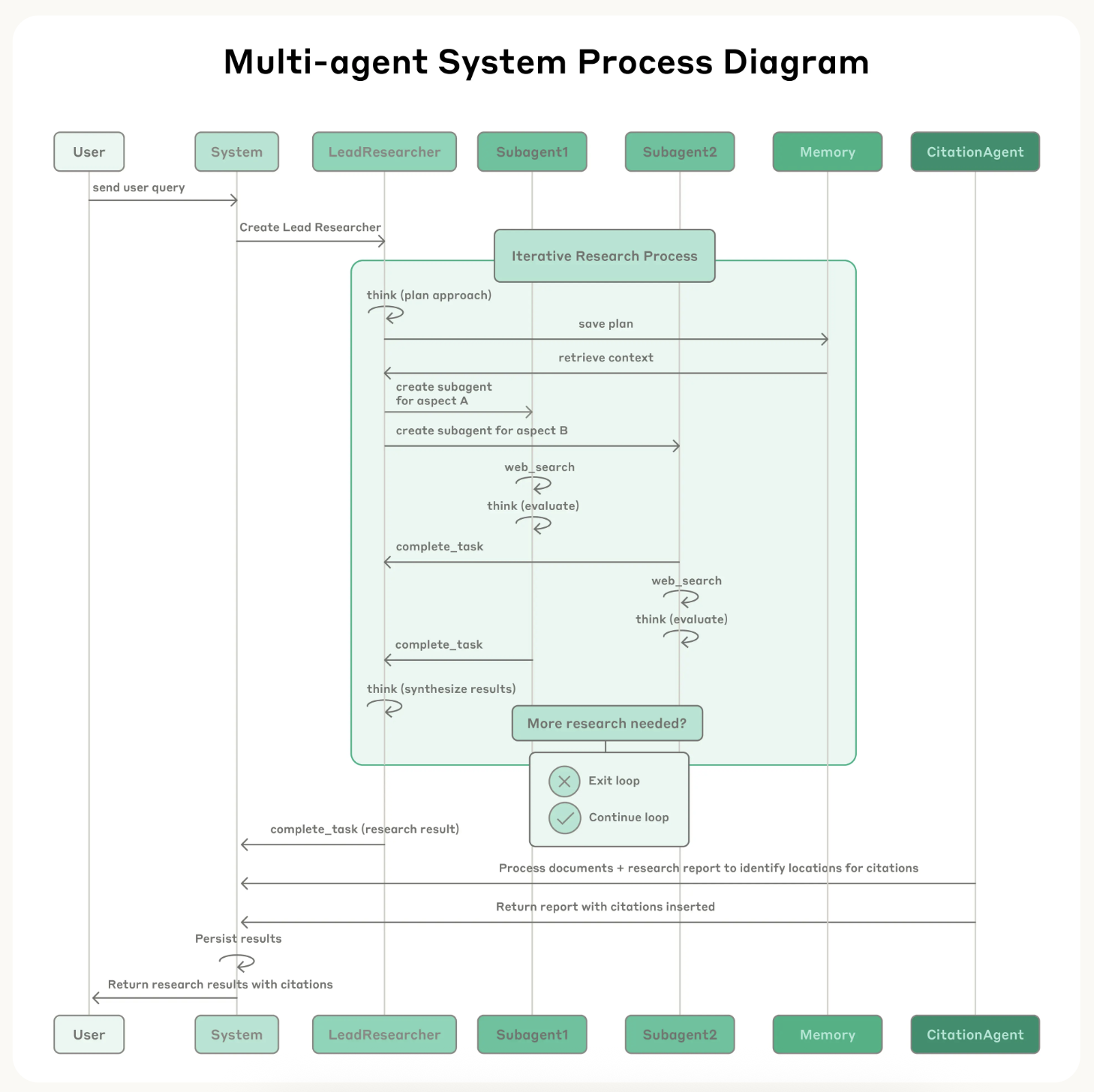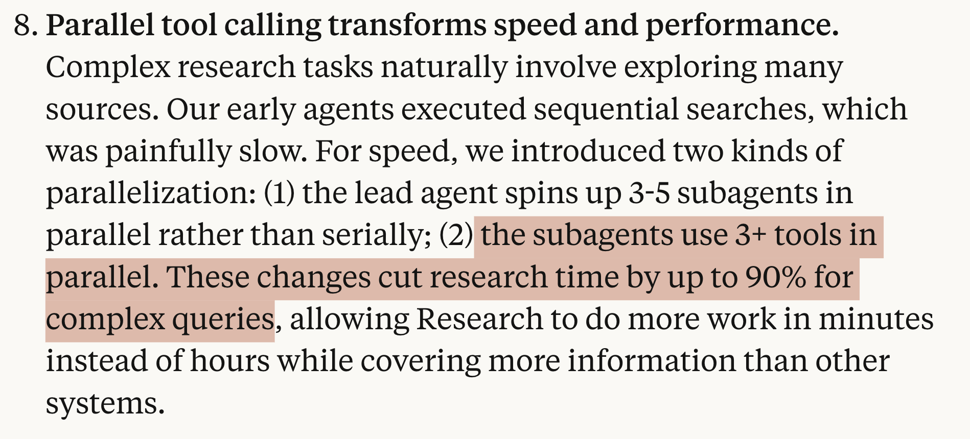 如上图,主智能体首先分析问题,识别出几个关键的研究方向,然后创建多个子智能体,分别负责不同领域的研究。每个子智能体独立工作,可以同时调用多个搜索工具,最终主智能体汇总所有的发现,形成完整的答案。