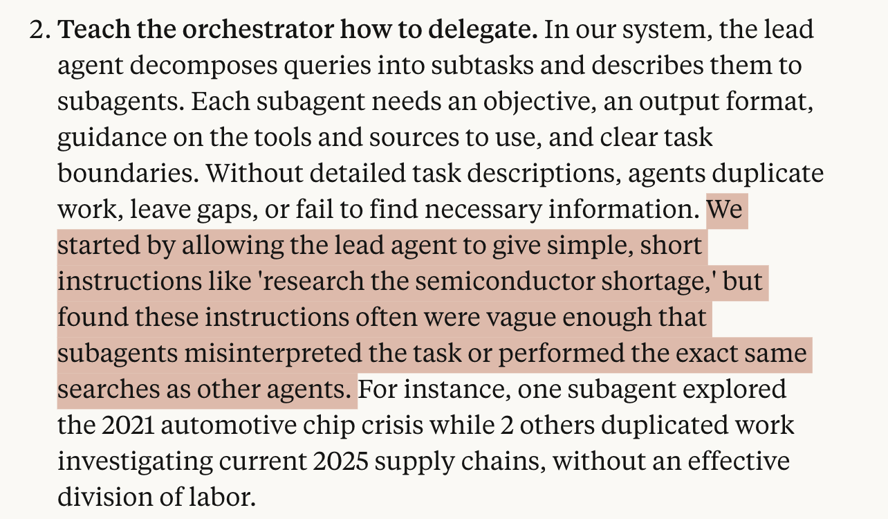 例如 Anthropic 发现:主智能体如果只是给出一句模糊的指令,比如“研究半导体短缺问题”,听起来挺明确,但底下几个子智能体执行出来的内容全是各说各话、不成体系,一个跑去复盘 2021 年的车规芯片危机,两个重复研究了 2025 年的半导体供应链,大家都很努力,但努力的方向完全没对齐。