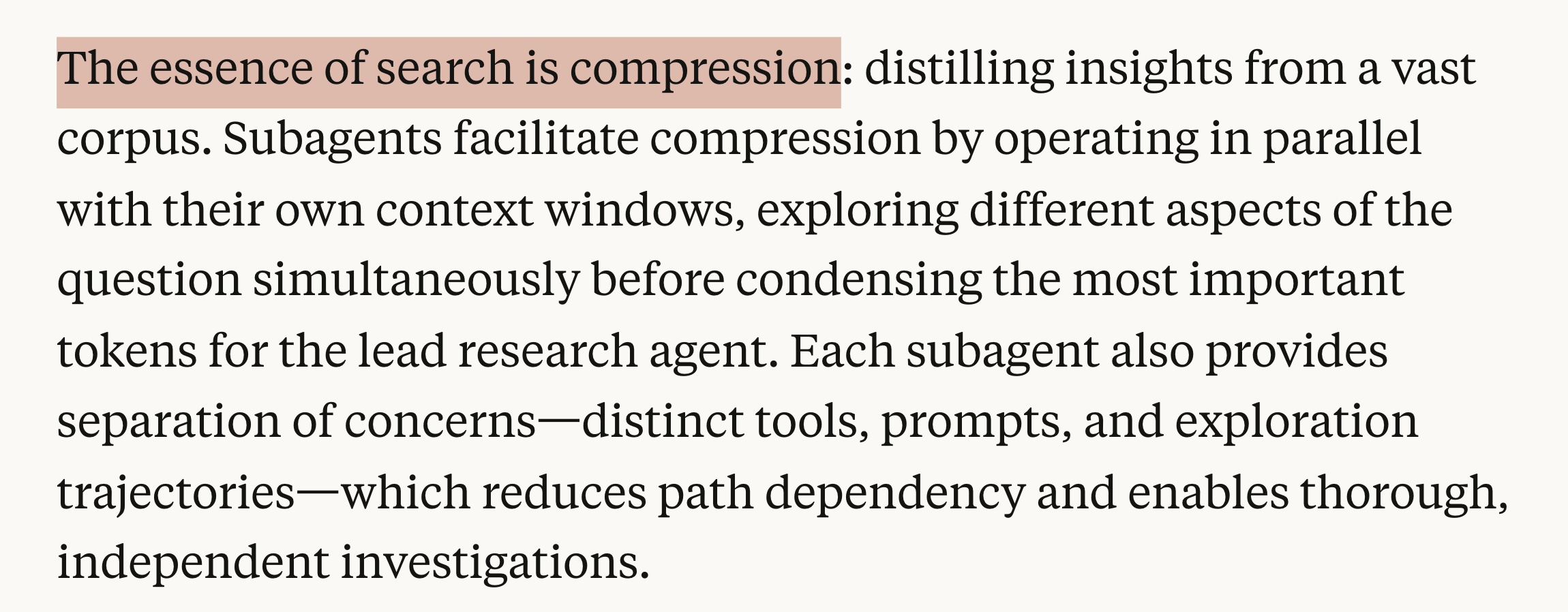 而多智能体协作时,每个子智能体像是执行专员,各自从不同角度去查资料、找关键点,然后再把他们认为最重要的内容提炼出来,交给主智能体统一汇总——这恰好就是搜索的本质。