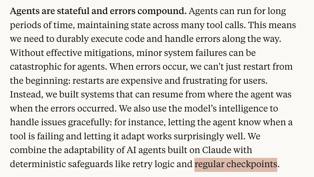 Anthropic 对此给出的思路是,引入类似“存档”的机制,也就是检查点机制。在任务的关键节点,主智能体会自动保存一次“系统状态”,如果后续子任务失败,系统就能从上一次成功的检查点恢复,而不是“推倒重来”。
