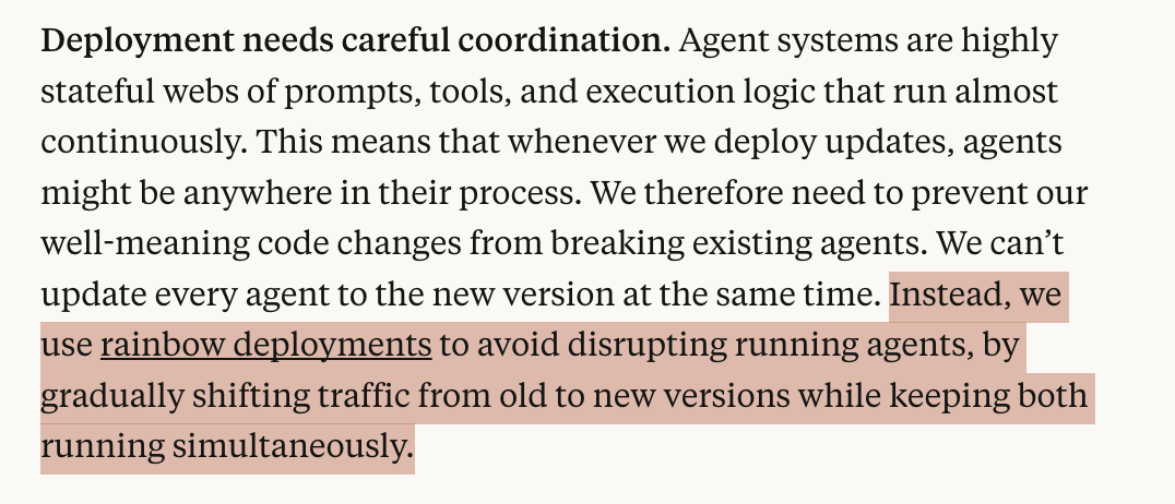 Anthropic 为了解决这个问题,引入了类似互联网产品常用的渐进式部署策略(又译作“彩虹部署”):新旧版本并行跑,先在小范围测试新版的稳定性,再逐步扩大范围,直到全面切换,确保新版本的更新平稳落地,不影响用户体验。