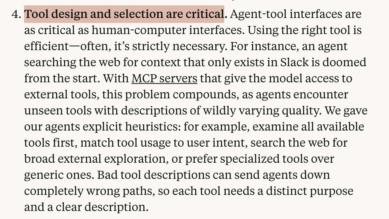 Anthropic 在实验中发现,很多任务失败并不是因为智能体不够聪明,而是没调用正确的工具。因此多智能体系统需要检查所有可用工具,把工具用法和用户意图对上,必要时上网广泛搜索,优先选专用工具而非通用工具,且每个工具都得有明确用途和清晰说明,方便智能体作出判断,避免因为对工具的描述不清,导致智能体跑偏。
