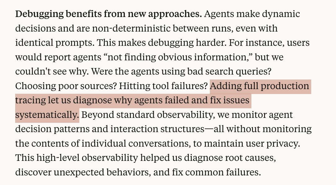 因此 Anthropic 在系统中引入了一套全链路Tracing日志,用来记录整个任务执行过程。包括每个智能体接到的任务指令、调用了什么工具、工具的响应情况、智能体中间的判断逻辑、输出的内容、收到的反馈等等,全都记录在案。