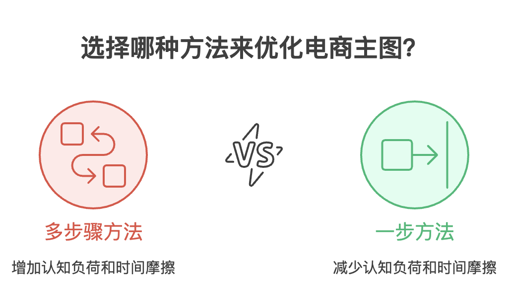 而真正高频的刚需,其实只容得下一次“本能点击”——把“我想要更高点击率主图”这句心智,压缩成一刀切的瞬时动作:上传即生成三张可直接 A/B 测试的主图草稿。当你把“功能点”拆到这种最小可行动单元,用户的认知负荷与时间摩擦几乎归零,复杂度被体验吞没——这才是颗粒度真正的深刻含义。