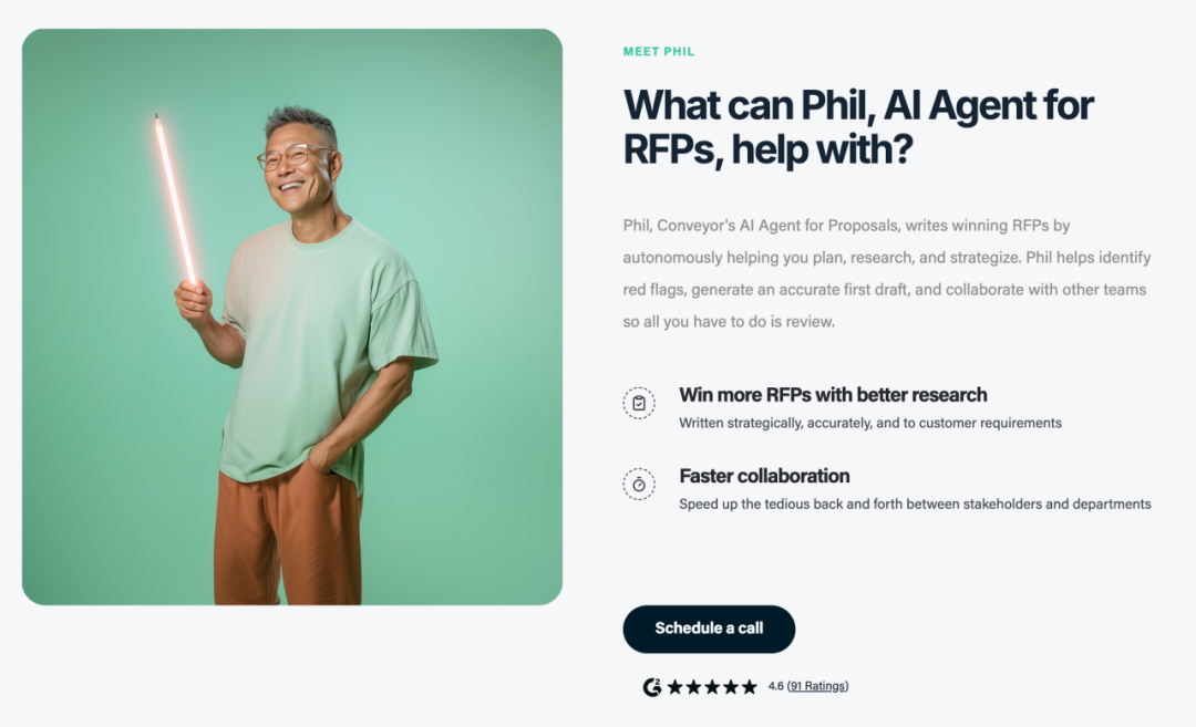 Phil则是Conveyor新推出的RFP专用AI agent,处理的是一个完全不同的挑战——需要更多写作、更多跨功能输入和更多细节处理。Phil能够独立编写完整的、适合销售的RFP回复。他不只是从静态答案库中提取内容——他会阅读文档、过往提交的内容以及来自产品、营销和工程等不同职能部门的内部内容,生成听起来像你的团队写的回复。Phil还处理协调工作:标记红线、识别风险、在需要时自动联系专家。由于他从实时资源(如wiki、共享驱动器、外部站点)中提取信息,无需维护庞大的内容库——系统会自动保持更新。